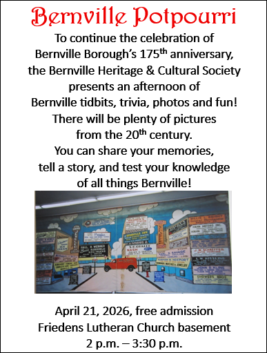 Bernville Potpourri 2:00 pm – 3:30 pmApril 21, 2026 Friedens Church537 N Main StBernville, PA 19506View Location View full calendar